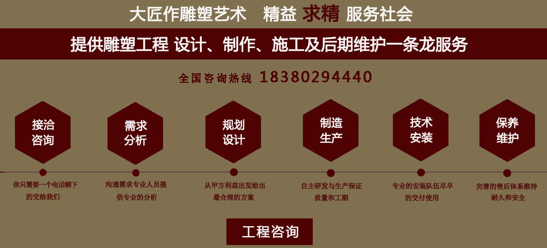 成都大匠作雕塑有限公司,是經(jīng)成都工商局審定注冊(cè)的正規(guī)專業(yè)雕塑制作及工程安裝服務(wù)機(jī)構(gòu),是由一群年輕富有朝氣的年輕人創(chuàng)辦,發(fā)軔于四川省成都市龍泉驛區(qū)。它是一家******于創(chuàng)作、制作和銷售為一體的公司。大匠作擁有多年從事公共藝術(shù)的專業(yè)人員和雕塑制作人組成的核心團(tuán)隊(duì),為您提供專業(yè)、具創(chuàng)新的設(shè)計(jì)及制作服務(wù)。公司成立以來(lái),秉承“******服務(wù)、誠(chéng)信為本”的宗旨,以客戶需求為目標(biāo)導(dǎo)向,不斷學(xué)習(xí),進(jìn)取,優(yōu)化和提高服務(wù)質(zhì)量,公司向您******——“您的滿意***是我們的信譽(yù)”,我們將以飽滿的熱情和******的服務(wù)贏得您的贊譽(yù)和支持。 愛(ài)心,細(xì)心,耐心,責(zé)任心是我們的要求,盡心盡職,為您打造出創(chuàng)新、專業(yè)、******的設(shè)計(jì)方案,我們堅(jiān)信先做人、后做事,用心對(duì)待客戶,實(shí)行透明收費(fèi),人性化服務(wù),本著對(duì)客戶負(fù)責(zé),對(duì)客戶負(fù)責(zé),更是對(duì)自己發(fā)展負(fù)責(zé)的態(tài)度,爭(zhēng)取做到讓每位客戶滿意